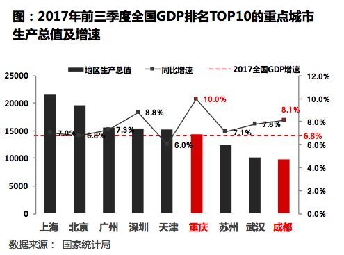 2017年,成都,重庆两城连续两年GDP稳居全国城市GDP前十,经济发展状态良好,生产总值与经济增速逐步与一线城市靠拢;