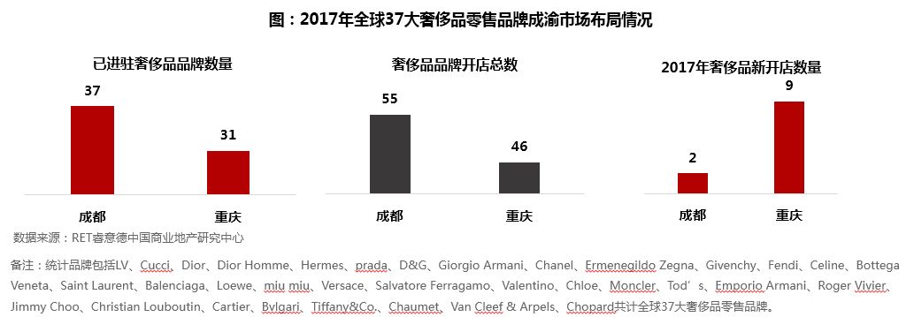 成都37大奢侈品品牌已全部进入,并且以55家高于品牌在重庆开店数量,整体表现突出;