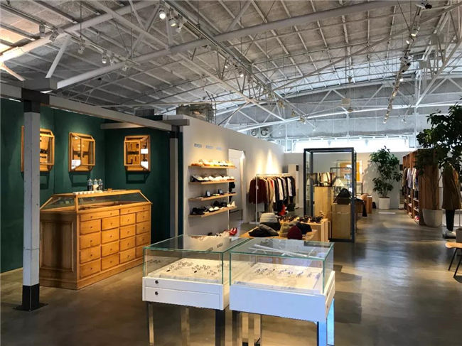 La Kagu 并不让人觉得拥挤,通过展示台的方式摆放的商品,业态分布自然而然的杂乱无章,甚至靠墙位置的商品会故意的乱一些,仔细观察一番,会发现许多有趣的细节,座椅都是陈旧而整洁的,试衣镜是用旧的水管改装的,洗手间与电梯的指示标有随手画上的气球,抬头可以看到房顶的支撑是与旧仓库相比没有太多变化,原来的仓库侧门被毛玻璃遮挡,成为柔和的光源……整个空间浑然一体,让人如同回到家中一般。