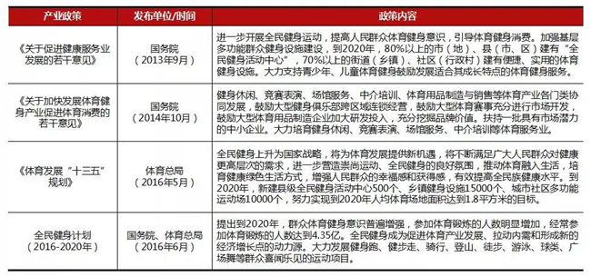 近年来,国家出台各类政策大力支持健康服务业、体育健身产业的发展,促进健身业态的扩张。