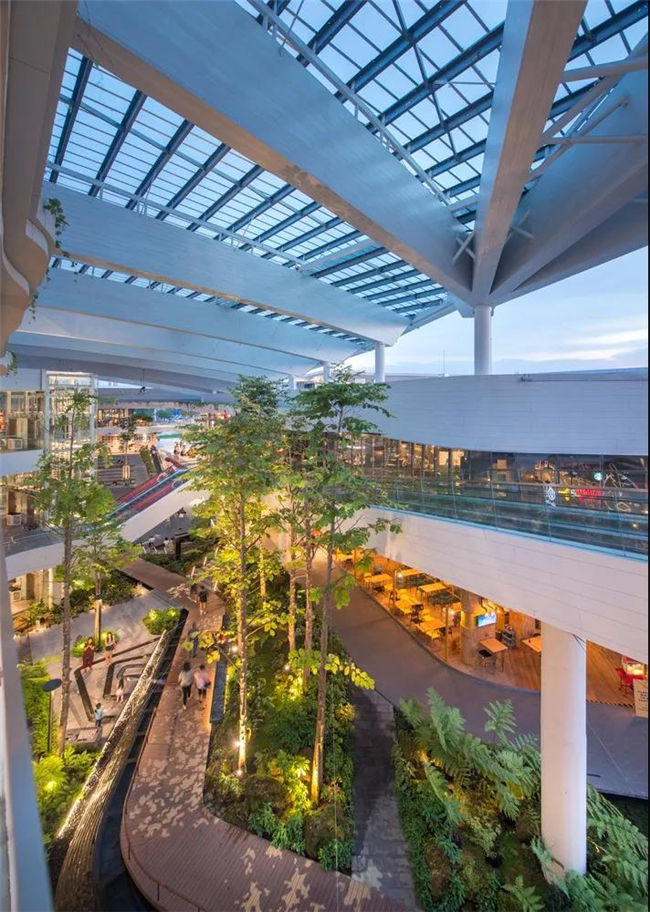 这是一个极佳的借鉴案例:1.添加了多重的绿植要素,将高端购物中心的标签变为了高雅;2.植物的选择和设计充分融合了城市文化的特质;3.植物元素与水元素、业态分布各自充分融合,合理衔接,增添了空间的层次感和灵活性。