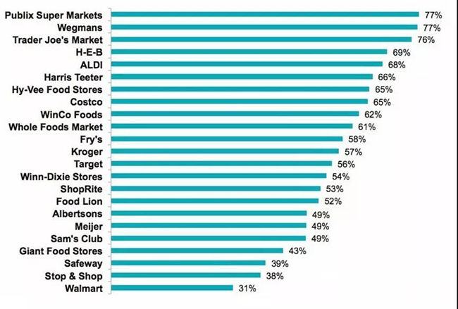 其中,不少生鲜超市都通过不同的运营方式,成功抢占市场。例如Wegman、Trader Joe’s和Whole Foods,它们在电商冲击和食品零售市场饱和的双重压力背景下,通过成功的运营受到美国大量消费者欢迎。对比分析后我们发现,它们的成功存在相似的内在逻辑,并能给予一定的启发。