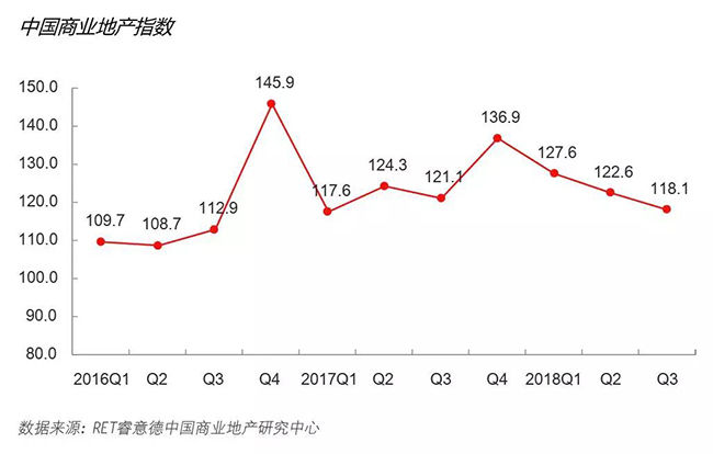 2018年第三季度,中国商业地产指数回落至118.1点,环比下降3.7%,同比下降2.5%。