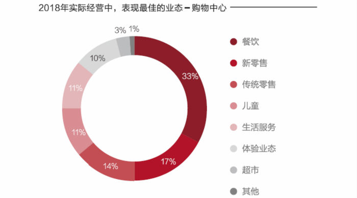 表现最不理想的业态:传统零售及超市成为购物中心在实际经营中表现最不理想的业态。线上零售的冲击是主要原因,尤其是在服装零售、日用品等领域。传统零售依旧增长乏力,万达出售万达百货引发行业关注。购物中心将持续扩大餐饮、新零售及体验类业态比例,与线上效率型消费形成差异化竞争。