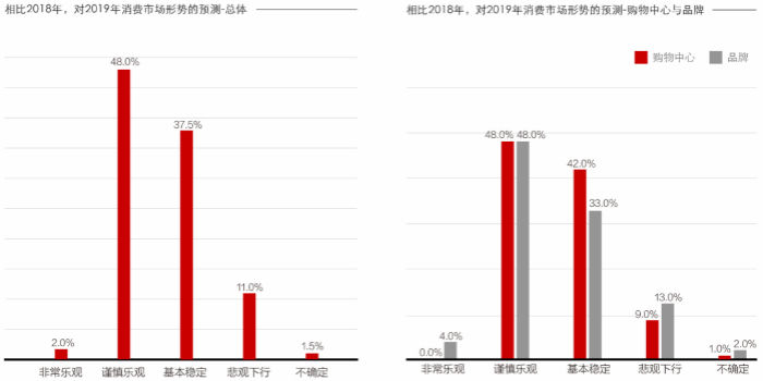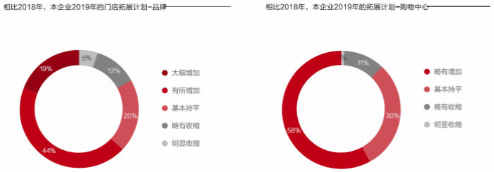 行业总体经营情况:接近半数受访者对本行业2019年经营状况持“谨慎乐观”态度,品牌商比购物中心持更乐观的态度。品牌受政策利好、拓展成本相对低等因素的影响,比由增量转存量的商业地产商,对预期更为乐观。同时,由于购物中心面临供大于求的窘境,品牌商相比购物中心在拓展时有更大的选择空间。