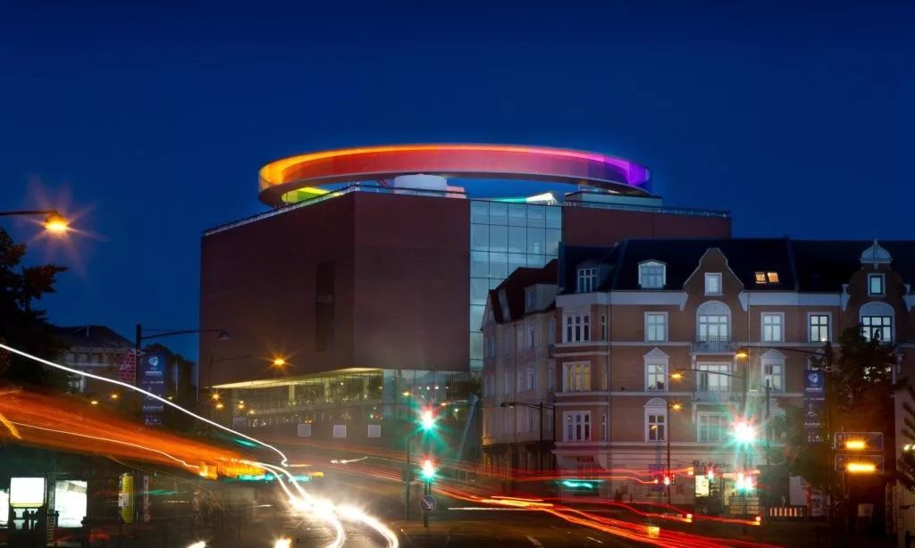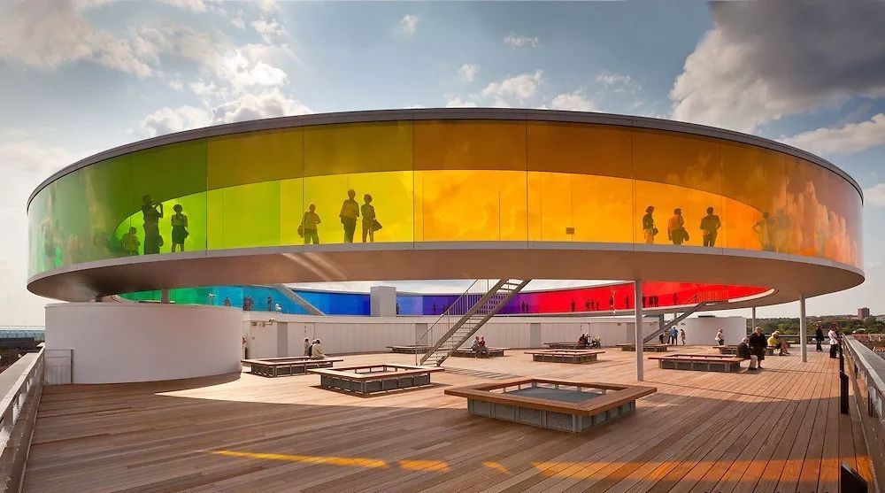Your Rainbow Panorama 位于丹麦奥胡斯ARoS 美术馆的屋顶,凭借其绚丽的颜色和独特的空间体验将这个原本平淡无奇的屋顶变成了世界闻名的“打卡点”。从街道望去,整个装置简单的线条和高饱和的颜色极其跳跃,而游逛其中的人们的剪影更是引人好奇,吸引更多人前往感受透过彩虹“滤镜”俯瞰城市的体验。