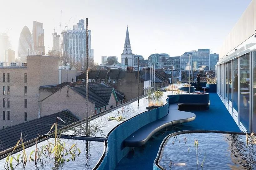 位于英国伦敦的Second Home 联合办公空间加建屋顶时,在设计上延续了整个项目的通透感和平面布置的灵动性。与现有平面相同,家具和天花板都采用了曲线造型,分为工作区和休闲区。工作区是与楼下办公空间相同的橙黄色调,休闲区的色彩则以蓝色调为主,形成撞色对比。整面落地玻璃带来的通透感,室内外家具造型的连贯性,和环绕室内外休闲区的绿植和水面,最大程度地削弱了室内外的隔断。