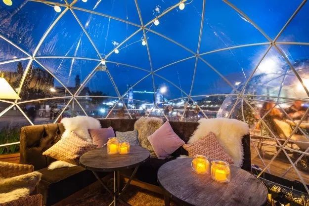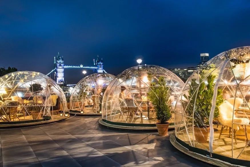 气候条件是屋顶商业的主要限制因素之一,尤其在北方地区。出现在纽约第五大道上的230 Fifth 打破了这一限制。230 Fifth 在其它季节与其它的屋顶酒吧并无太大不同,但2016年的冬季,这里突然出现了许多透明的“泡泡”。这些用PVC材料制成的igloo帐篷可以容纳多达12人,内部可以加热,同时轻便、易收纳。冬日置身于igloo之中,在温暖的环境中享受美酒美食,透过透明的薄膜欣赏城市夜景,独特新奇的体验让igloo bar 风靡社交媒体,次年冬天更是在波士顿、华盛顿、伦敦等城市出现。