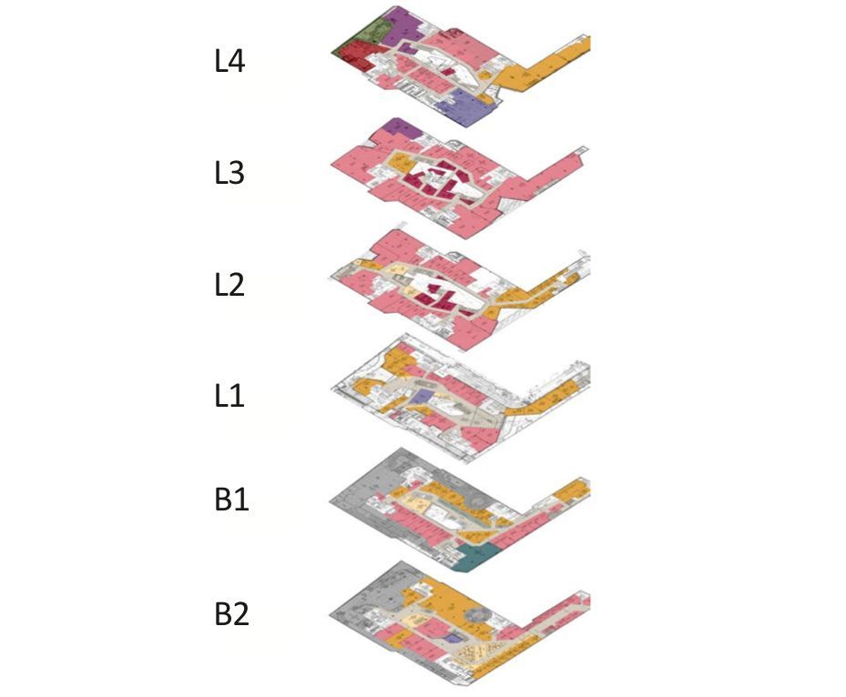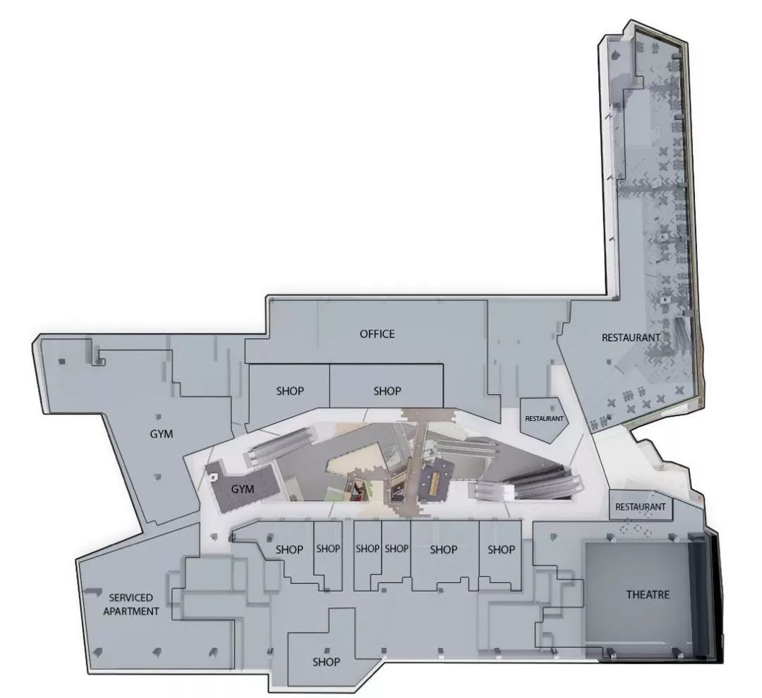 Funan Mall 实际上也遵循了高区引流的传统做法,即把目的型业态置于高区,如位于最高层4层的健身房、游泳池、剧院等。