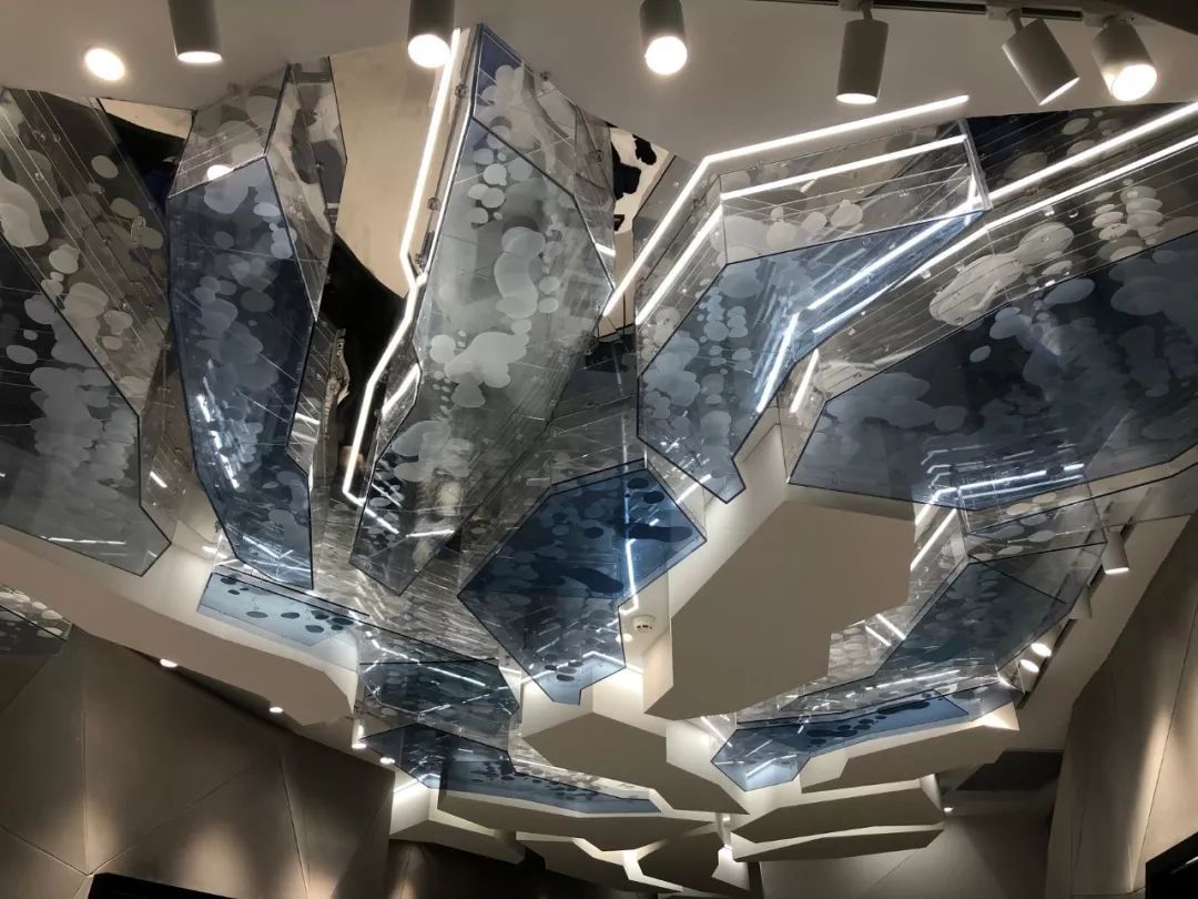 如二层 CANADA GOOSE 店面的吊顶呈现一片碎裂的冰川,这个吊顶的设计独立于店面设计之外,是一个专人设计师作品,是全世界所有 CANADA GOOSE 中特有的装饰,十分贴合其羽绒服产品的使用场景。