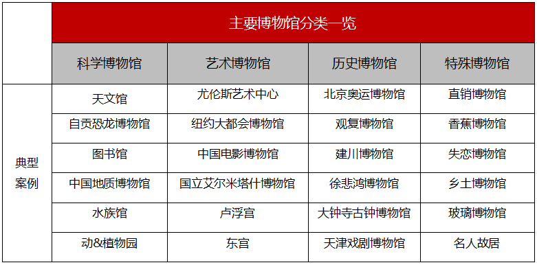 按照传统区分方法,博物馆可以按照其展出内容区分成四个大类: