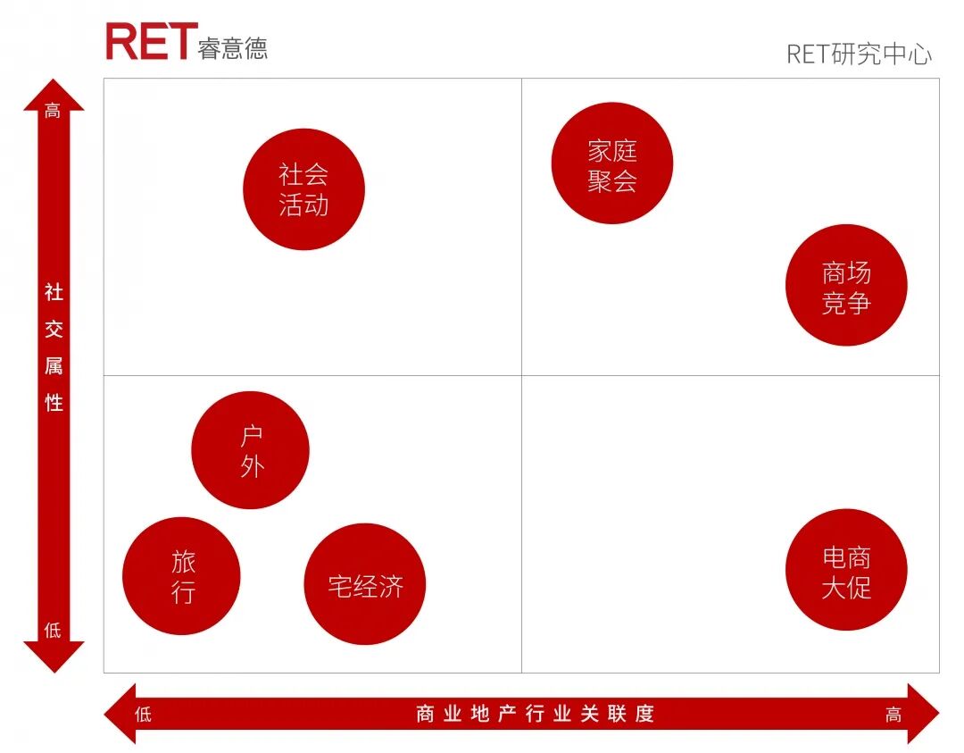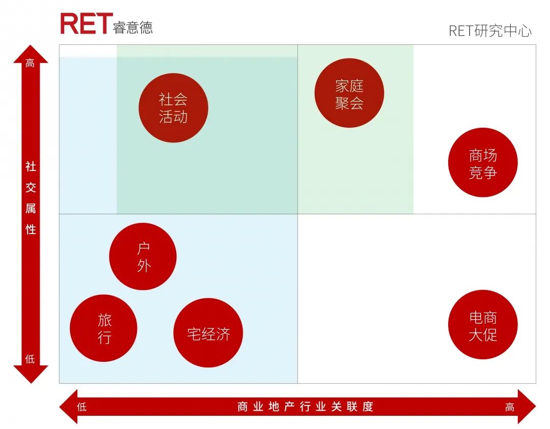 在和行业贴合更紧密的象限中的绿色方框区域内,往往竞争力度不高,比如家庭聚会、亲子关系、教培、社会活动这样的领域,是否存在着更多的活动思路以供给层出不穷的新需求?是否可以进一步挖掘顾客的内生需求,并沿袭着这个脉络打通拉新、复购、游逛的链条?购物中心设置的活动有无围绕着家庭成员的关系,社会活动的社群关系去打造?