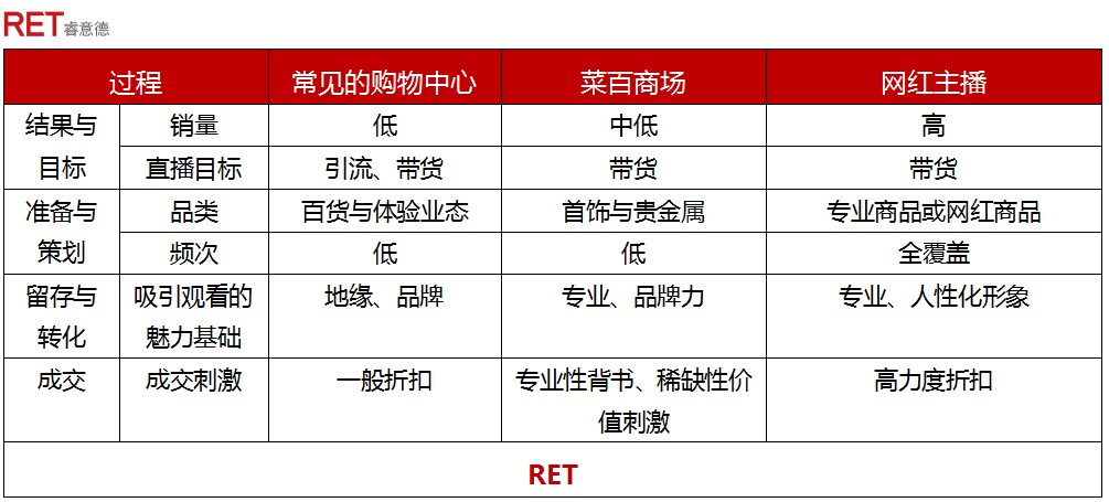 相比网红主播和菜百商场,购物中心在直播世界里,直接在出发点上就天然不足,购物中心作为资产运营方,完全不具备对商品的掌控力,以至于在选品上,既不能找到自身的优势领域寻求单点突破也不能直接从结果倒推,直接找到最具销量潜力的商品,最后囿于自身的商品供给范围。另一方面,在留存与转化环节中,购物中心由于不直接面向顾客,也导致了自身专业能力的不适配,相比菜百这样品牌力十足的专业交易商或者垂直领域的KOL,购物中心也在专业性上失去了话语权,导致留存效果不佳。最后困于自身的商业模式,在成交刺激的力度上往往取决于与商户的协商结果,自然也无法和专业百货、网红主播相比。