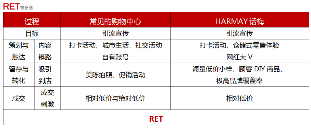 相比在短视频营销领域内做得比较好的知名网红美妆零售商话梅harmay,购物中心对于营销链路的理解力缺失就更为明显。即使是到了新的流量平台,以新的内容形式交付,大多数购物中心的营销内容仍旧以城市生活为主,吸引有相关需求的人到店消费,而话梅选择了以自己最突出的特点创造打卡动机,在切合着顾客的需求前提下,以自身的特点进行宣发工作。换言之,购物中心做短视频的目的是引入新流量,但内容却是告诉本打算过节的人到店过节,而话梅选择的是突出自己的新形式消费体验,以此来吸引更多的网红来打卡探店,再借助KOL的力量进行更大力度的传播。
