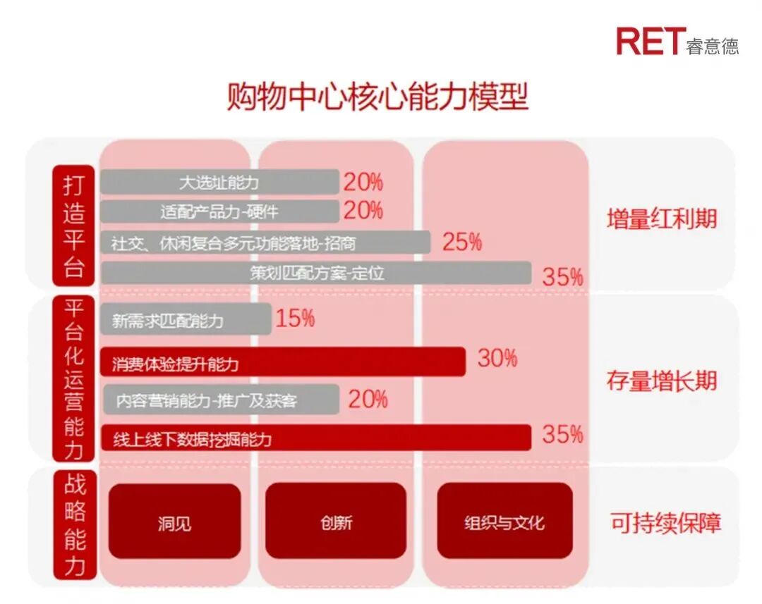 增量时期购物中心是在交付产品,与地段和消费需求契合的定位、产品力与招商构成了主要交付能力。存量时期购物中心交付服务,这个时期的重要能力转变成线上线下数据挖掘能力以及消费体验的提升能力。以上关于实体商业在不同发展时期的能力模型正是来源于此。实体商业是商业地产运营企业在战略方面的选择,其在底层需要有对未来发展洞见、创新能力和组织文化方面来保障可持续性。增量到存量的关键能力分析,我们可以看到聚焦线上线下数据挖掘和消费体验提升是存量时代运营实体商业的关键能力,即在业务层面的创新从此着眼和入手是最指向提升效率的可行方向。