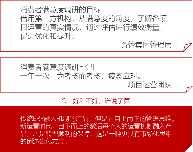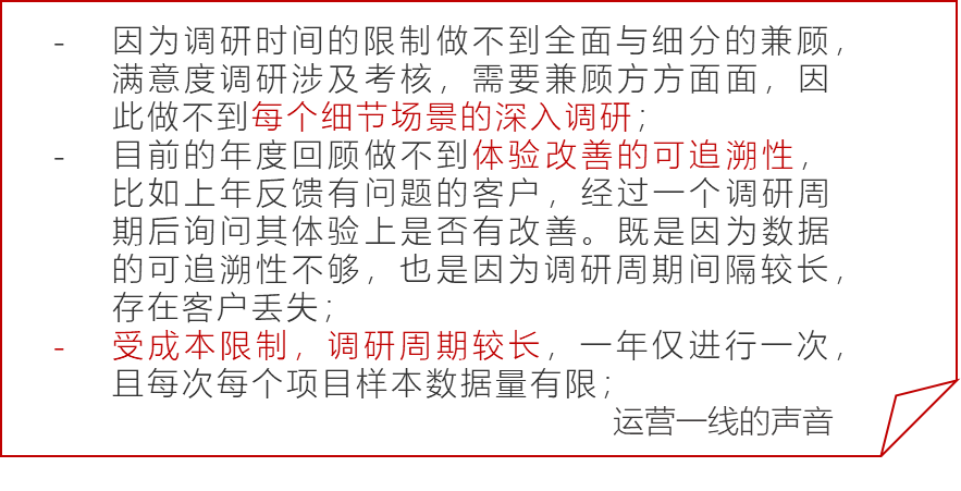 对于管理来讲,传统KPI考核下的消费者满意度线下调研如同制造了一个盲盒,既无法实现管理者看到“真相”的目的,也难起到消费体验改善的作用。我们再看看项目团队作为被考核者的困惑: