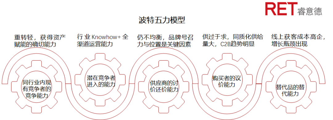 借助波特五力模型我们不难分析出,失去地产开发红利市场的企业纷纷转向轻资产方向的必然,但究其本质和最终目标,是要获得存量时代的新能力:打造利于获得运营赋能的复利创新的能力;基于行业经验的线上运营能力;流量获取和复购粘性能力。通过以上新能力的打造获得资产附加价值的赋能确定性,从而结合金融杠杆兑现或获取稳定资产价值的增长。