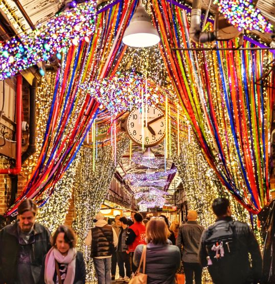 坐落于百年红砖建筑中的Chelsea Market,保留着裸露的天花板与斑驳墙壁,搭配五颜六色的灯带与门帘,在复古工业风中透出烟火气的温暖,档口林立、风味多元,吸引人们穿梭其中边吃边聊,在历史与现代交融的空间里,自然而然地促成了人与人之间的交流与归属感 ©网络