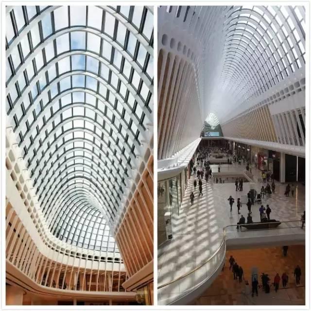 玻璃+金属架打造的屋顶让蓝天和白云成了商场中最自然的点缀,不仅增加了商场对自然光线的利用度,漆成白色的金属框架也营造了更明亮的空间感;