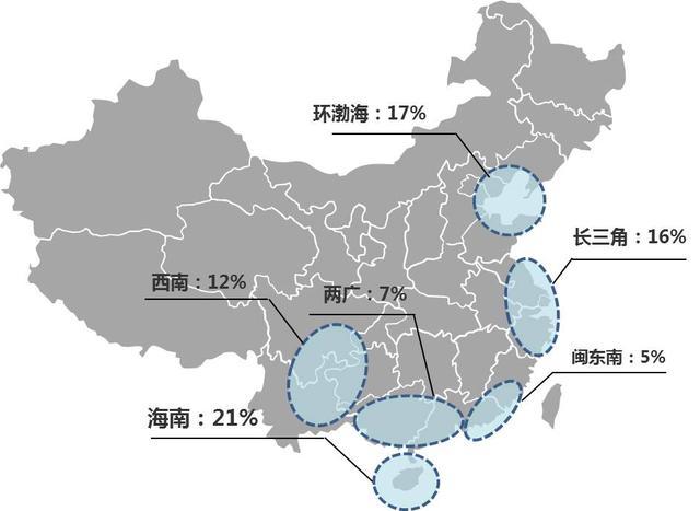目前,我国文旅地产主要集中在自然资源较好的区域,区域发展不均衡性明显。海南、环渤海、长三角三大区域的项目数量最多,分别占全国文旅地产总数量的21%、17%和16%。最近几年,西南、两广和闽东南地区的文旅地产发展也异常迅速,六大区域共占到全国文旅地产总数的78%。