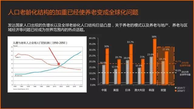 美国人口调查局2016年4月的最新研究显示,2020年之前,全球人口结构中年龄65岁以上的人口数量将开始超过年龄在5岁以下的儿童人口数量。虽然世界各个地区之间差异较大,但全球经济一体化趋势下,蝴蝶效应所带来的影响将迅速由个案国家波及全球,这一数据还是引起了不小的关注。中国作为人口老龄化进程最为迅速的人口大国,养老产业的发展已不仅是自身经济的关注点。